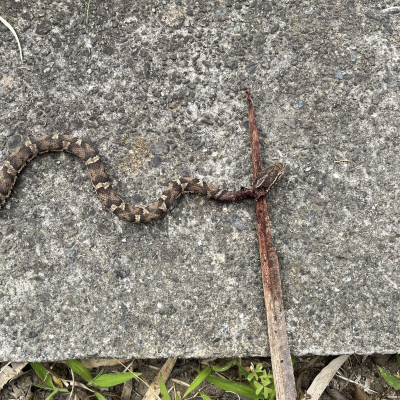 ぱっと見が先ほどのヘビとは若干異なるヘビ。ただし近所の方いわく「ヤマカガシじゃないか?」とのことなので、ヤマカガシは色や模様が複数あると理解しておくことにします。苦笑