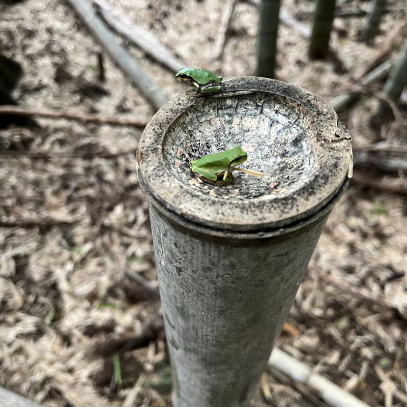 竹林の周辺には田んぼが広がり川もあるせいか、アマガエルに限らず数種類のカエルがピョンピョン跳びまわっています。