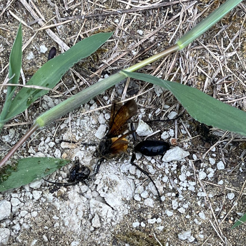 今年の夏場、竹林の傍の宅地部分で草むしりをしていたところやたらとブンブン大きな羽音を立てて突進してくる虫がいまして、ある時タイミングを見計らって足で踏んづけたのがこの写真の虫。