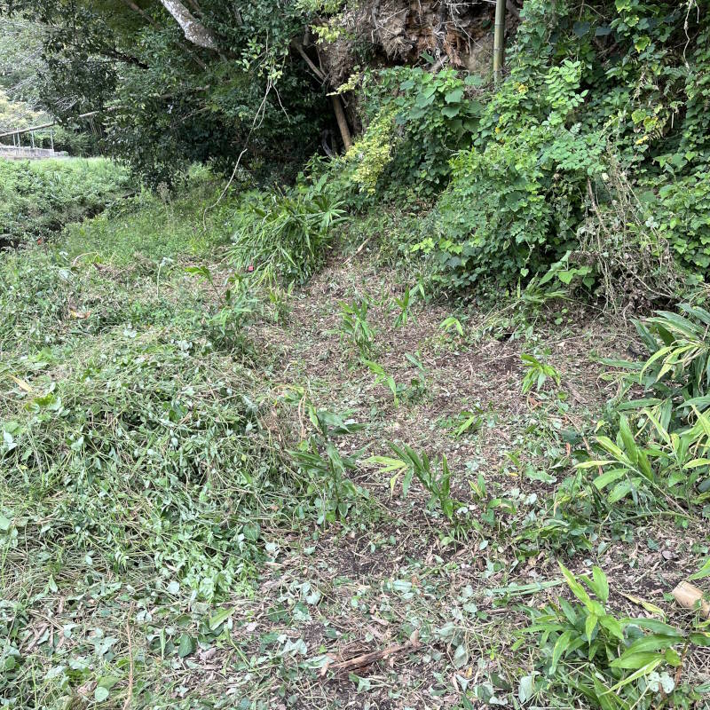 草刈り鎌を使って手で刈ってもよかったのですが、今回はミョウガの捜索が主目的ですのでタケノコ掘り用の鍬で大雑把に刈り倒してみました。一部ミョウガの葉(偽茎?)も一緒に刈った気がしますが見なかったことにしました。