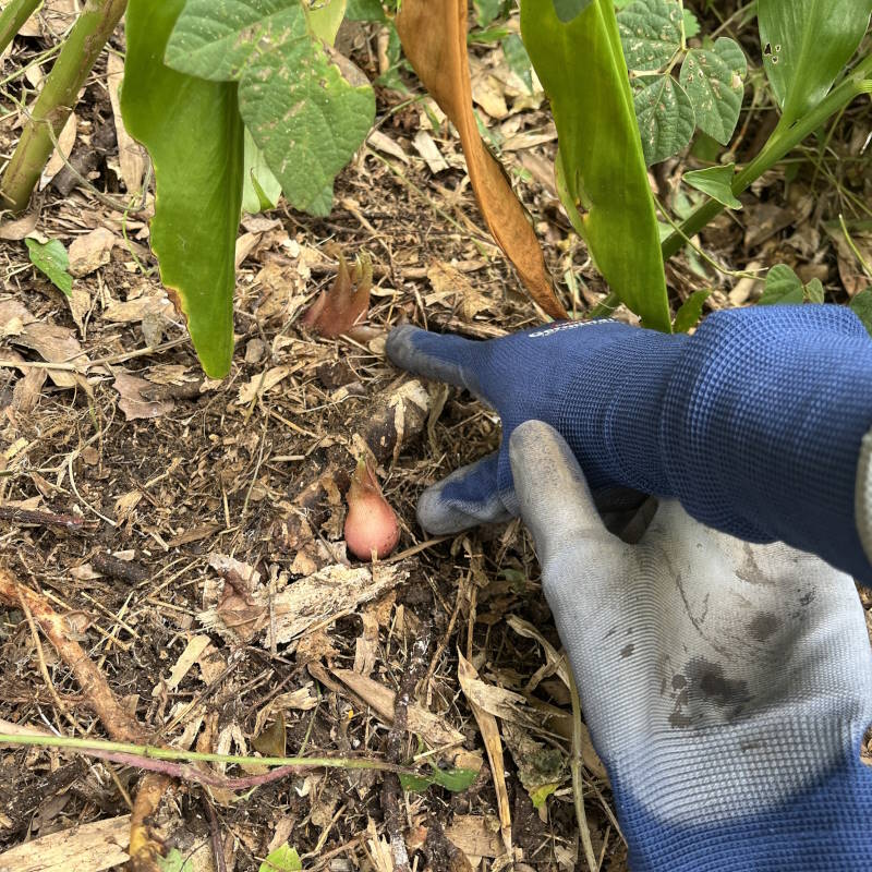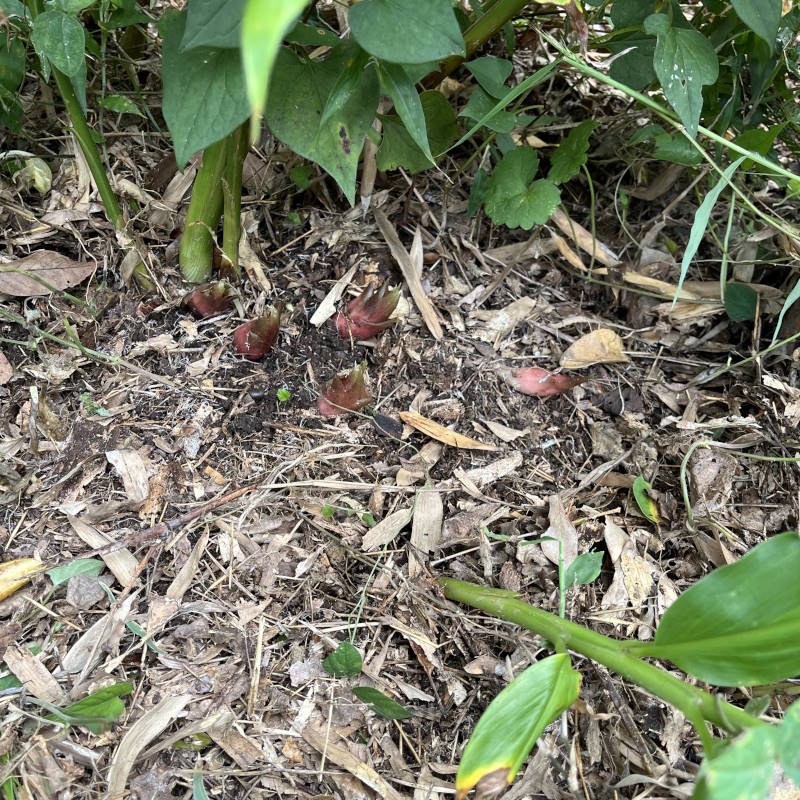 このような形で地面からいくつものミョウガが出てきていました。同じ地面から頭を出す食べ物なのにタケノコと比べてなんと見つけやすい&収穫しやすいことか!笑